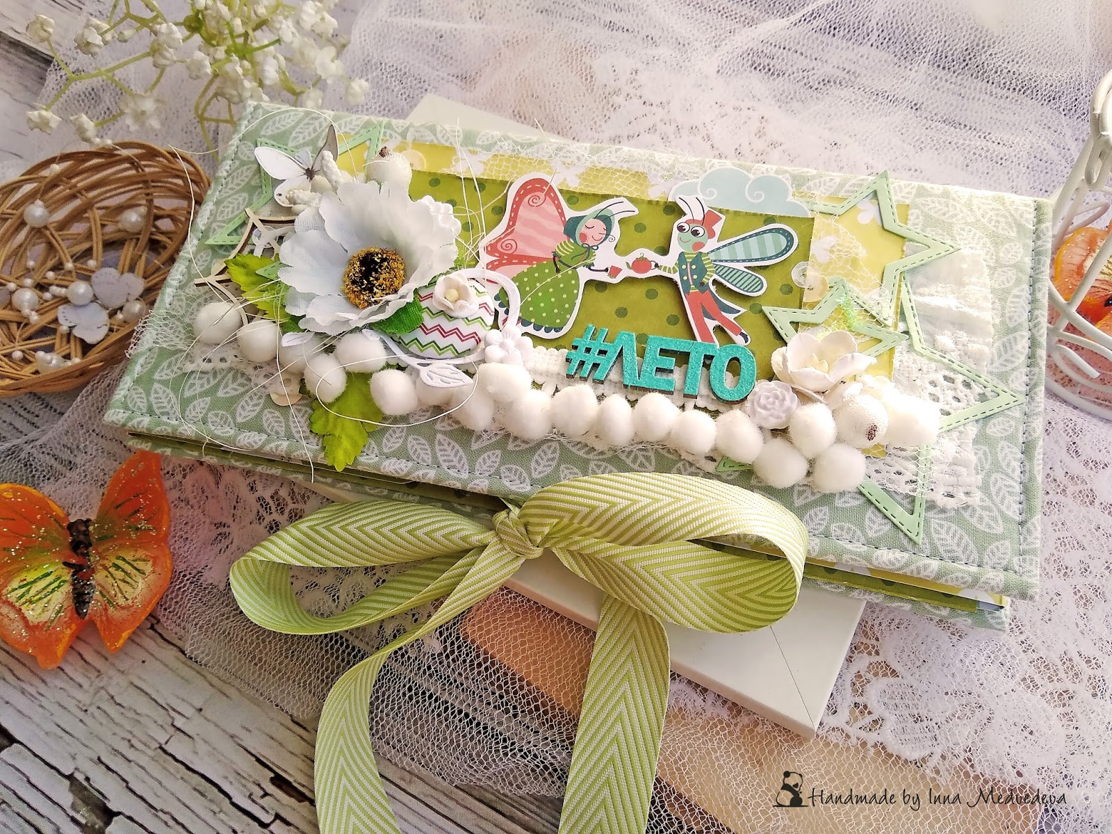 Так же украсила обложку чипбордом из коллекции, высечками, фишкой, тесьмой с помпонами, вырубкой и шитьем